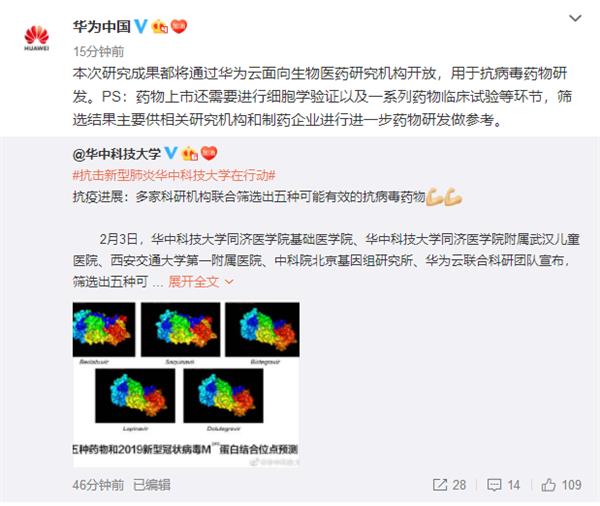 2月3日,华为宣布联合华中科技大学、中科院等研究机构筛选出了五种可能对2019新型冠状病毒(2019-nCoV)有效的抗病毒药物,相关成果将通过华为云向研究机构开放。
