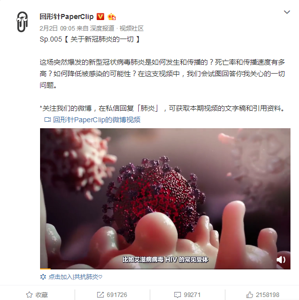 近日,回形针团队制作的一段科普视频《关于新冠肺炎的一切》火了,该视频在微博上的播放量超过8000万次,转发量超过69万,全网播放量已超过1亿。该视频全长约10分钟,其中采用了大量视频、图片、图表素材,通过直观的动画将原本难以理解的原理展示的淋漓尽致,看后有豁然开朗之感。