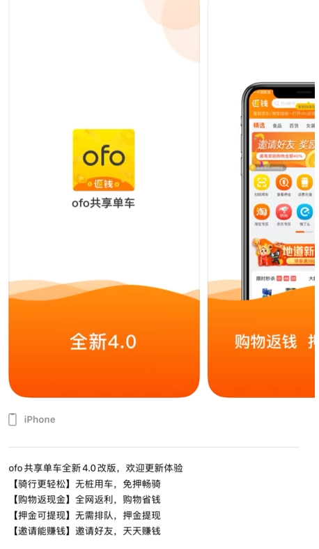 在大家共同战役的时候,ofo共享单车APP悄悄发布了全新4.0版本。出人意料的是,ofo已经转型为电商返利平台。根据App Store介绍,【骑行更轻松】无桩骑车,免押骑行、【购物返现金】全网返利,购物省钱、【押金可提现】无需排队,押金提现以及【邀请能赚钱】邀请好友,天天赚钱。成为了全新ofo的四大特色。
