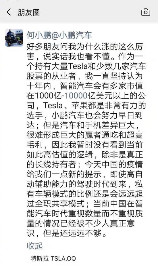 小鹏汽车的创始人何小鹏朋友圈发文评价特斯拉股票大涨,他认为,十年内,智能汽车会有多家市值在1000亿-10000亿美元以上的公司,Tesla、苹果都是非常有力的选手。汽车和手机差异巨大,很难形成巨大的赢者通吃和超高毛利,因此暂时没有看到当前如此高估值的逻辑。