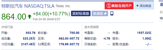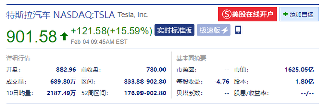 北京时间2月4日晚间消息,特斯拉(Nasdaq:TSLA)开盘大涨13.3%,报883.76美元,特斯拉市值超1500亿美元。随后,截至到北京时间22点45分,特斯拉股价报901.58美元,市值超1600亿美元。