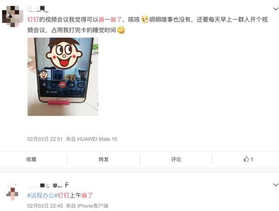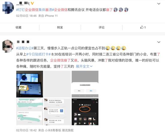 人工智能企业的运营合伙人大为也提到了类似情况。他所在的企业日常会用到企业微信和钉钉,而在远程办公第一天,企业微信崩了,勉强在钉钉上开了四个电话会议。他吐槽,“这应该是阿里第一次在社交领域打爆腾讯吧”。