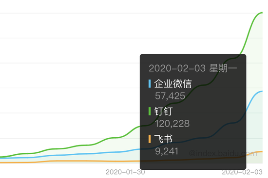 百度指数显示,自一月末以来,钉钉、企业微信的搜索数据持续大幅上涨。企业微信方面向新浪科技提供的数据显示,开工第一天(截至2月3日下午6点前),数百万企业使用企业微信,是去年同期的三倍,数千万用户使用企业微信远程办公。