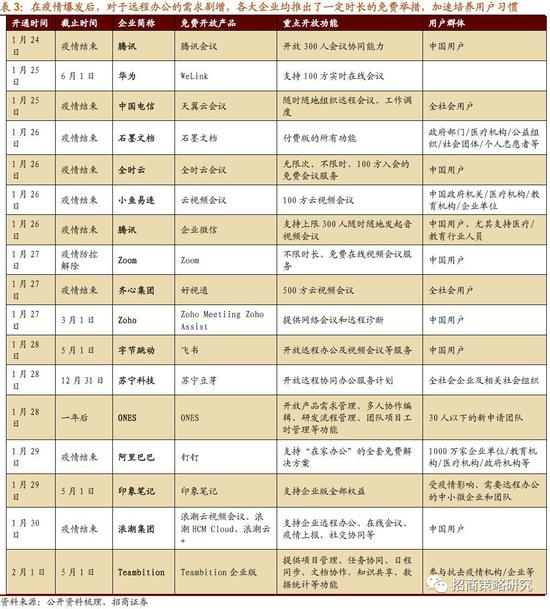 在协同办公方面,1月24日到3月1日期间,腾讯会议面向所有用户免费开放了100人不限时的会议功能;1月27日,飞书宣布,1月28日-5月1日期间,将向所有用户免费提供远程办公及视频会议服务;