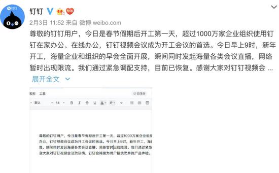 2月3日中午,钉钉方面对故障给出回应。据其表述,春节假期后开工第一天,超过1000万家企业组织使用钉钉在家办公、在线办公,钉钉视频会议成为开工会议的首选。而早上9时,新年开工,海量企业和组织的早会全面开展,瞬间同时发起海量各类会议直播,网络暂时出现限流。
