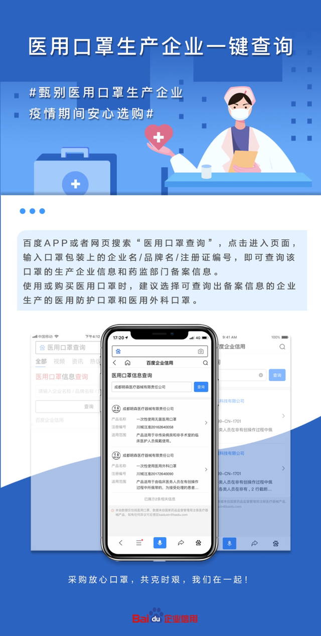 辨别生产厂家的资质成为民众的当务之急。日前,百度企业信用上线了“医用口罩生产企业一键查询”功能,一键搜索即可快速查询医用口罩生产企业信息和药监部门备案信息,帮助大家快速锁定具备医用口罩生产资质的企业。