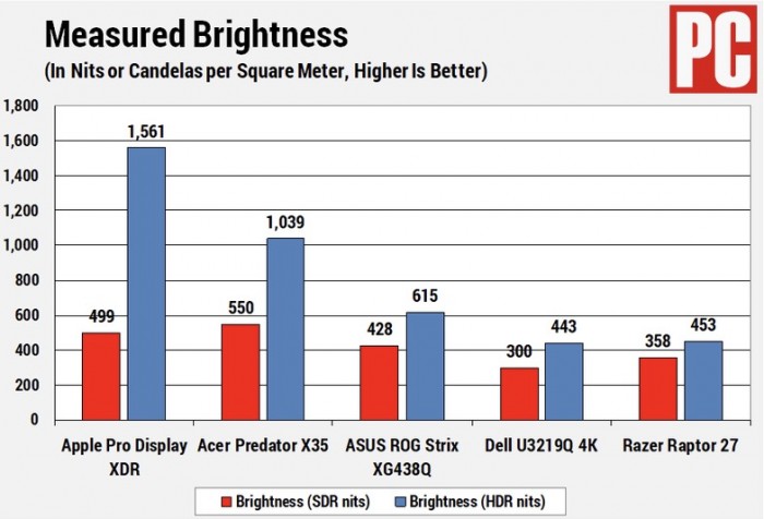 在 Adobe RGB 色域测试中,Pro Display XDR 的覆盖率为 96.7%,击败了 Acer Predator X35、华硕 Rog Strix XG438Q、戴尔 U3219Q 4K 和 RAZER Raptor 27。不过与 Pro Display XDR 对比的这些显示器都属于游戏显示器。