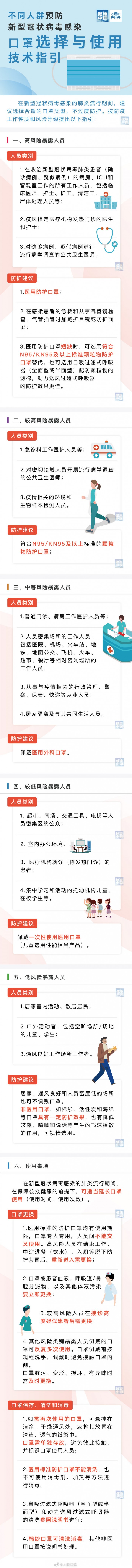在新型冠状病毒感染的肺炎流行期间,为指导不同人群科学合理地选择和使用口罩,严防新型冠状病毒感染的肺炎疫情蔓延和扩散,制定了《不同人群预防新型冠状病毒感染口罩选择和使用技术指引》。现印发给你们,请参照执行。