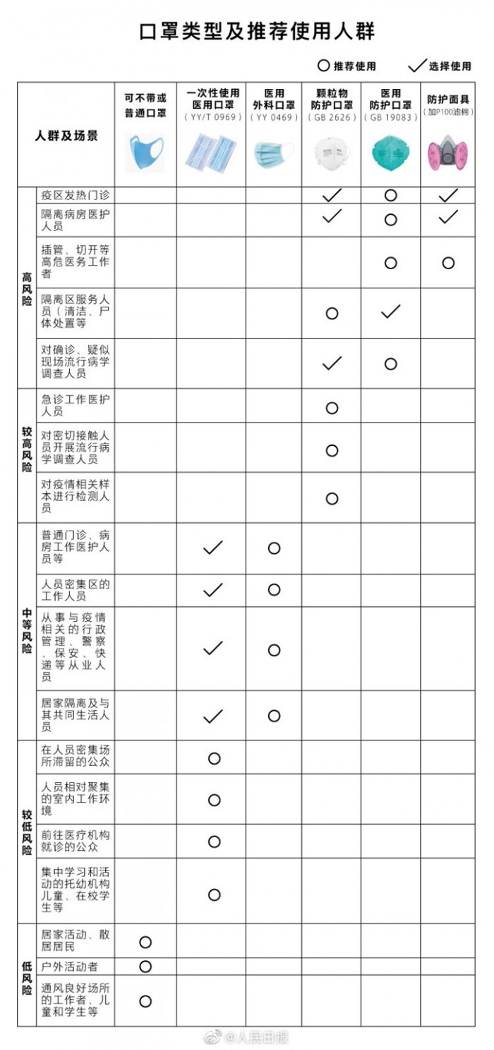 在新型冠状病毒感染的肺炎流行期间,建议选择合适的口罩类型,不过度防护。按防疫工作性质和风险等级提出以下指引: