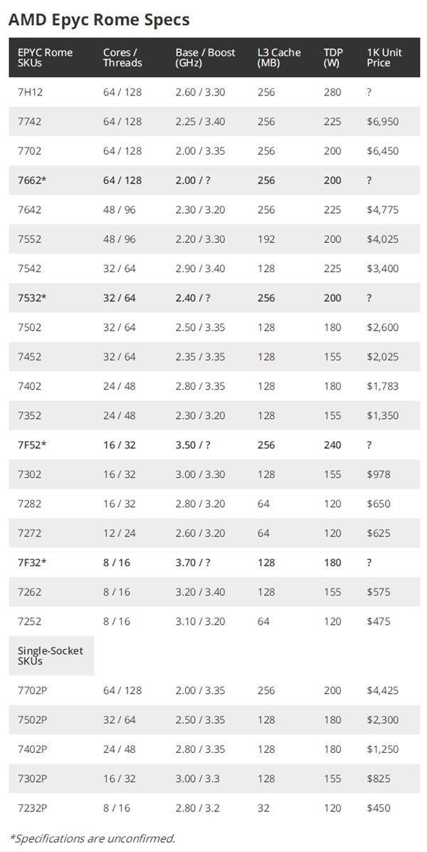 一是霄龙7662,64核心128线程,三级缓存256MB, 基准频率2.0GHz,加速频率未知,这些和霄龙7702几乎完全一样,估计加速频率会比3.35GHz略低,价格也更便宜。