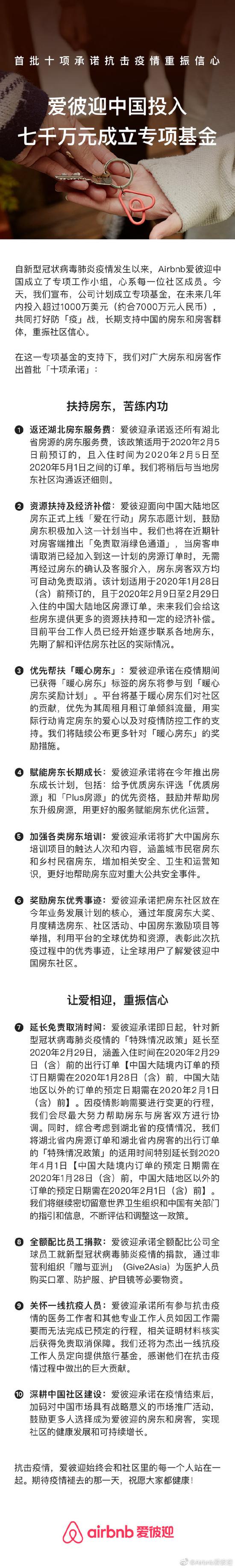 同时,爱彼迎中国宣布首批十项承诺。其中包括,承诺返还所有湖北省房源的房东服务费,该政策适用于2020年2月5日前预订的,且入住时间为2020年2月5日至2020年5月1日之间的订单。此外,面向中国大陆地区房东上线“爱在行动”房东志愿计划,将在近期针对房客端推出“免责取消绿色通道”,该计划适用于2020年1月28日(含)前预订的,且于2020年2月9日至2月29日入住的中国大陆地区房源订单。爱彼迎中国表示,未来会给这些房东提供更多的资源扶持和一定经济补偿,包括优先为其周租月租订单倾斜流量等。