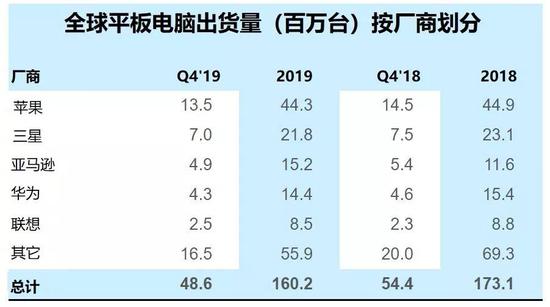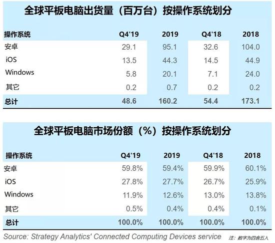 2月5日下午消息,据Strategy Analytics发布的最新研究报告指出,2019年Q4联想平板电脑的出货量同比增长8%至250万台,其市场份额增长了0.9个百分点至5.2%。苹果2019年Q4仍为全球平板电脑出货量第一,但出货量同比下降了7%。