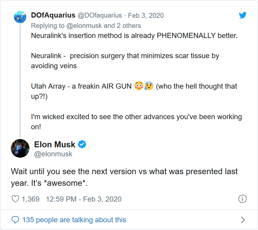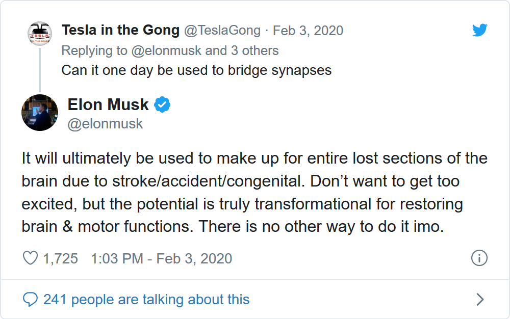 如果Neuralink能在这条漫长的道路上一路走下去,马斯克希望它能像特斯拉对电动汽车一样对人们产生革命性影响。“它最终将被用来弥补由于中风/意外事故/先天性缺陷而失去的大脑部分。”
