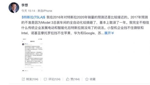 2月5日消息,理想汽车CEO李想今天在投资社区雪球上发布状态称,“我在2016年对特斯拉2020年销量的预测还是比较接近的。2017年预测的不准是因为Model 3总装车间的全自动化给搞砸了,基本上耽误了一年。