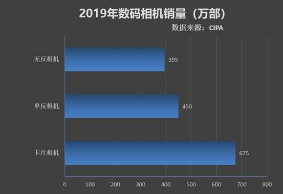 从相机的机型构成来看,2019年,卡片机销量减少22%,降至675万部;单反相机减少32%,降至450万部;此外,无反相机销量为395万部,占整体的26%,虽然销量也在下降,但是总体占比提升了不少。