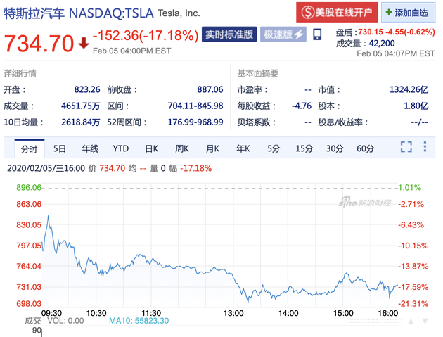 北京时间2月6日凌晨消息,周三收盘,特斯拉股价暴跌17.18%,报734.7美元,创下了史上最大跌幅,分析师下调该股评级,特斯拉涨势戛然而止,在此前两个交易日中,特斯拉股价累计涨幅达到36%。