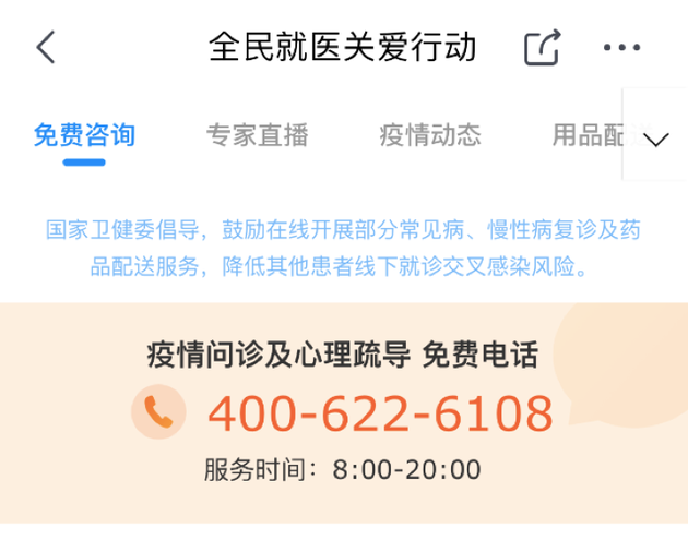 1月26日,京东健康上线了“防范阻击新型冠状病毒肺炎”的平台,面向全国各地区出现咳嗽、发热、乏力、腹泻等症状的用户,免费提供在线问诊服务,同时还向寻求心理帮助的用户,特别是高强度、高压力环境中工作的一线医务人员,提供免费的心理疏导热线服务。