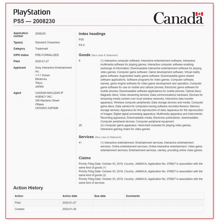 在欧洲方面,PS5于2020年2月4日通过德国法律办公室注册。在加拿大,该申请已于1月27日提交。在加拿大,已经要求对“ PS5”和“ PS 5”进行保护。
