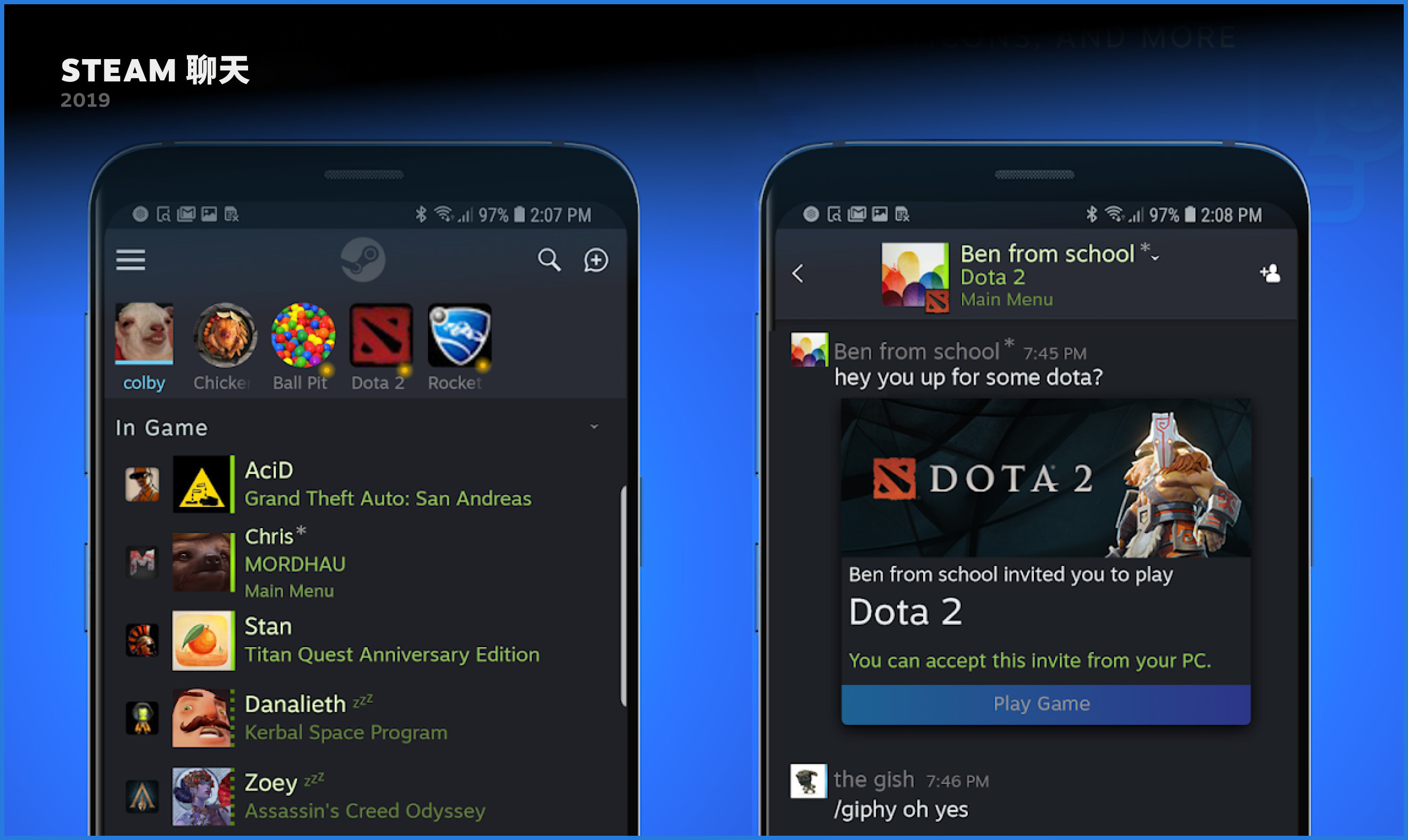 我们在 2018 年对 Steam 聊天进行了改进,作为后续措施,我们在 2019 年 5 月发布了 Steam 聊天移动应用,以便用户即使不在 PC 旁也能保持联络。 该应用安装次数超过 100 万(1/3 是 iOS 版,2/3 是 Android 版),且平均每天发送 100 万条推送通知。