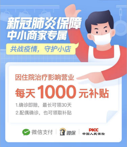 为减缓中小商家的经营压力,微信支付联合微保推出了“新冠肺炎中小商家保障”。据介绍,全国使用微信支付官方收款码收款且开通收款有礼的中小商家,均可使用1积分免费领取保障,商家或其配偶一旦确诊“新冠肺炎”,每人每天可得到1000元的住院补贴。