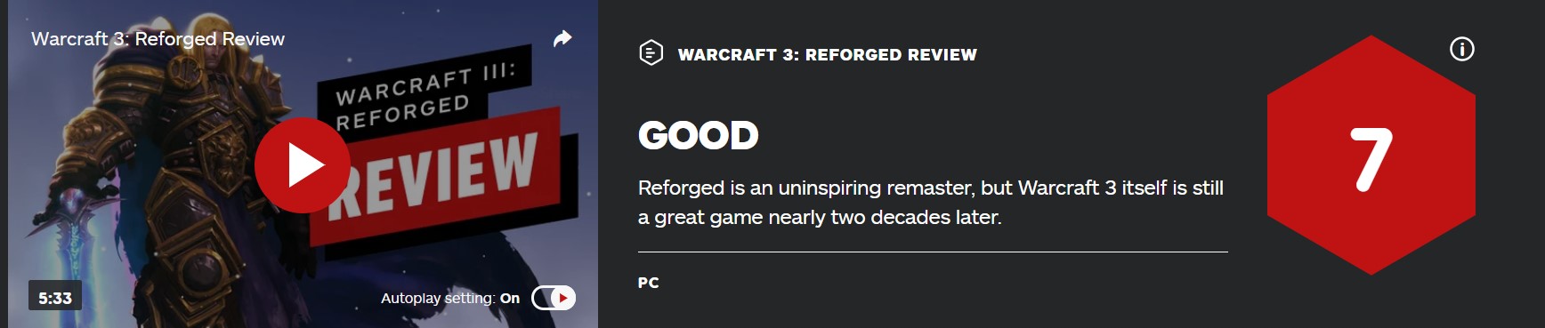 之前受到玩家大量差评的《魔兽争霸3:重制版》IGN今日(2月6日)为其打出7分,IGN表示游戏还不错,虽然《魔兽争霸3:重制版》并不是一款令人振奋的游戏,但在近20年后它依然是一款伟大的游戏。