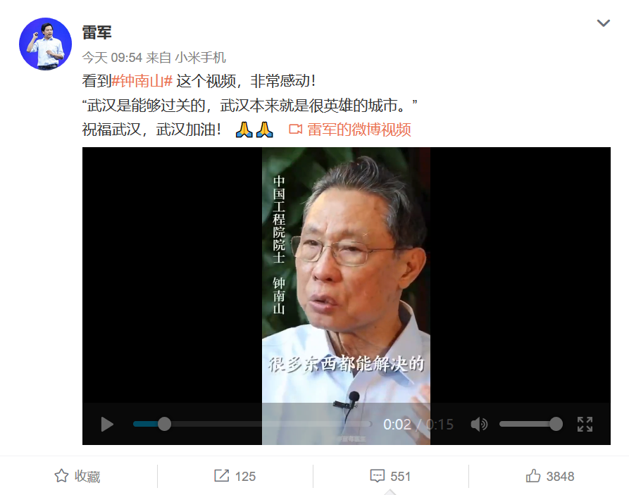 小米创办人,董事长兼CEO雷军通过个人官方微博发布祝福称,看到钟南山这个视频,非常感动!“武汉是能够过关的,武汉本来就是很英雄的城市。” 雷军表示,“祝福武汉,武汉加油!”