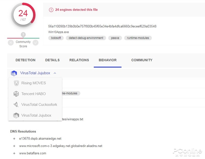 和ViruSCAN相比,VirusTotal的功能会更强大,这不仅体现在VirusTotal支持更多的杀毒软件,还在于它能提供更加专业的文件行为分析报告。VirusTotal会分析某个文件的具体所作所为,包括访问的网络、读取的文件、修改的注册表等等,而且还能够选择不同的文件行为分析引擎,非常强大。