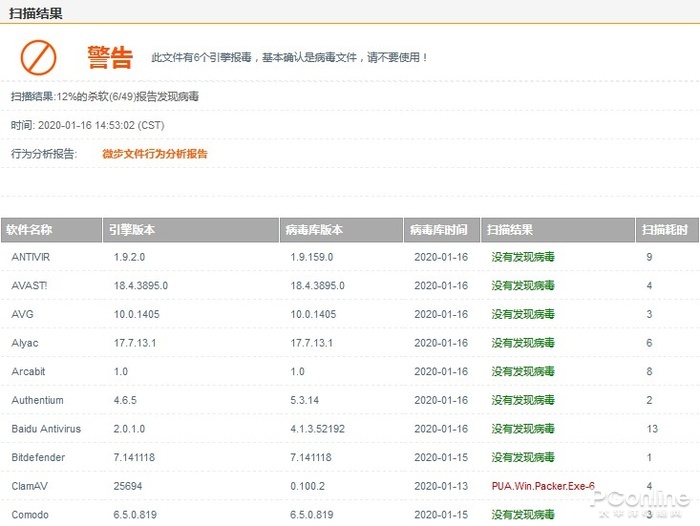 VirusTotal的扫描速度非常快,而且扫描后会优先将判断有毒的杀软列在上方,方便你观察到底是哪个杀软报了毒。