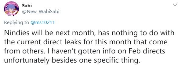 此前根据另一位任天堂爆料人士 Zippo 所说本月可能将有两场任天堂直面会,其中一个将是即将到来的《集合啦!动物森友会》直面会。不过据 Sabi 在 Twitter 回复中所说,他目前对二月份任天堂直面会的情报还知之甚少。Sabi 在 Twitter 中说道:“Nindies 将在下月举办,与其他人泄露的本月直面会没有关系。不幸的是除了一件明确的事情外,我还没有获得二月直面会的相关信息。”
