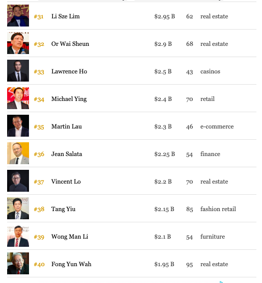 以下是《福布斯》发布2020年香港50大富豪榜单: