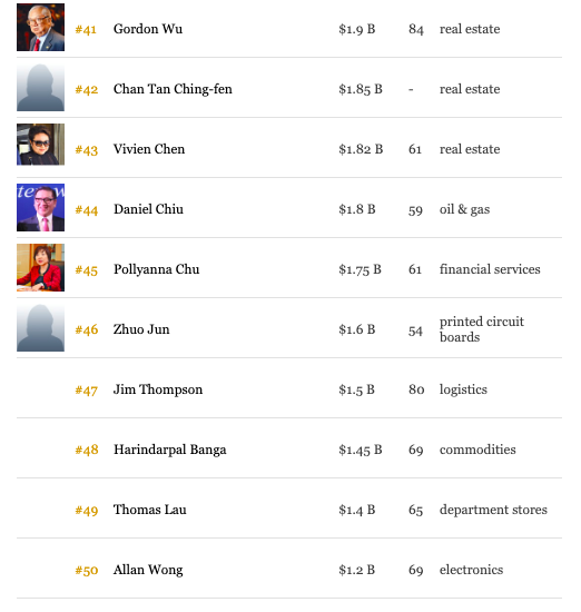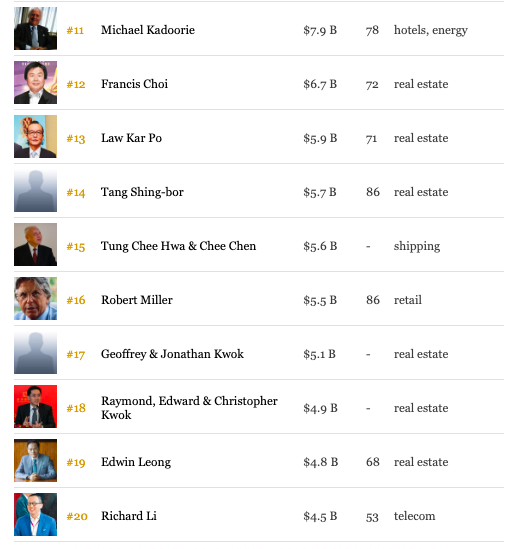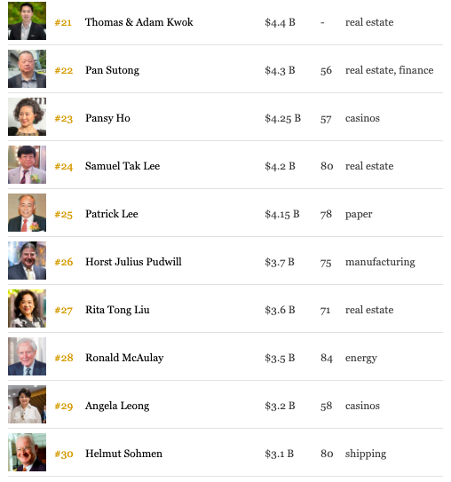 第4至10位依次为:刘銮雄(169亿美元)、吕志和(154亿)、李文达(152亿)、邝肖卿(137亿)、吴光正(116亿)、蔡崇信(115亿)、 杨建文和林惠英夫妇(80亿)。