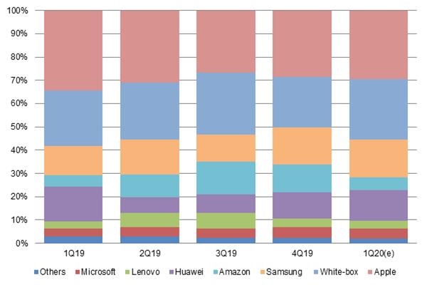 在2019年第四季度,全球平板累计出货4330万台,其中,中国白牌厂商因消化库存,导致出货量明显下滑。厂商排名方面,苹果依然稳坐龙头老大,三星第二,3~5名分别是亚马逊、华为和微软,联想跌出前五。