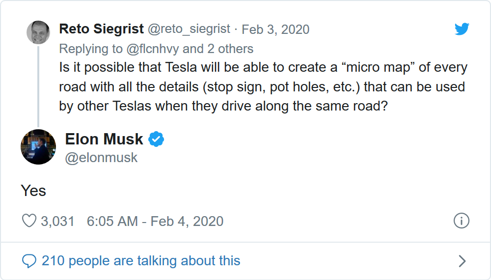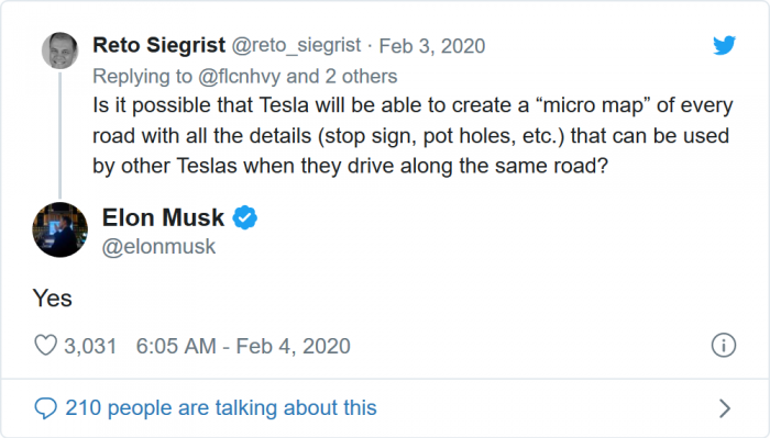 当被问及特斯拉是否可以使用这种新3D标签来创建坑洼地图时,马斯克的回答是肯定的: