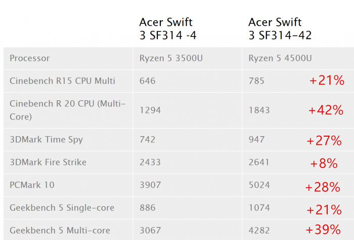 1月的CES上,AMD发布了7nm APU,采用Zen2 CPU+Vega GPU的架构组合,首发15W低电压和45W标压产品,前者主要面向轻薄本,后者主要面向游戏本。来自乌克兰的一家网站,率先分享了Ryzen 5 4500U的性能测试数据,它搭载于宏碁Swift 3笔记本上(电池容量50.29Whr)。