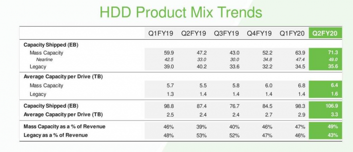 希捷将HDD硬盘业务分为传统及大容量两部分,其中传统指的是2.5寸硬盘,大容量就是主力的3.5寸硬盘了,Q2财季中出货的大容量硬盘总容量为71.3EB,平均容量6.4TB,传统硬盘总容量35.6EB,平均容量1.6TB。