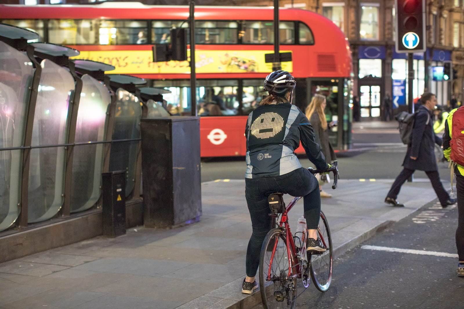 夹克可以显示三种表情符号:开心的脸,生气的脸和中性的脸。它还显示左箭头和右箭头,可用于指示自行车的旋转方向。甚至可以显示一个危险符号。这款与福特Share the Road合作打造的夹克使骑手能够表达自己的感受,并在他们与其他道路使用者之间建立重要的情感联系。