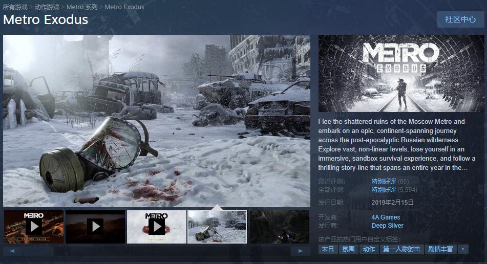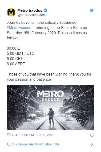 开发商4A Games今天证实,在Epic游戏商店独占发行一年之后,《地铁:逃离》将进军Steam。本月晚些时候(2月15日)就可以下载了。消息来自4A游戏的社交媒体渠道。开发人员在推特上写道: