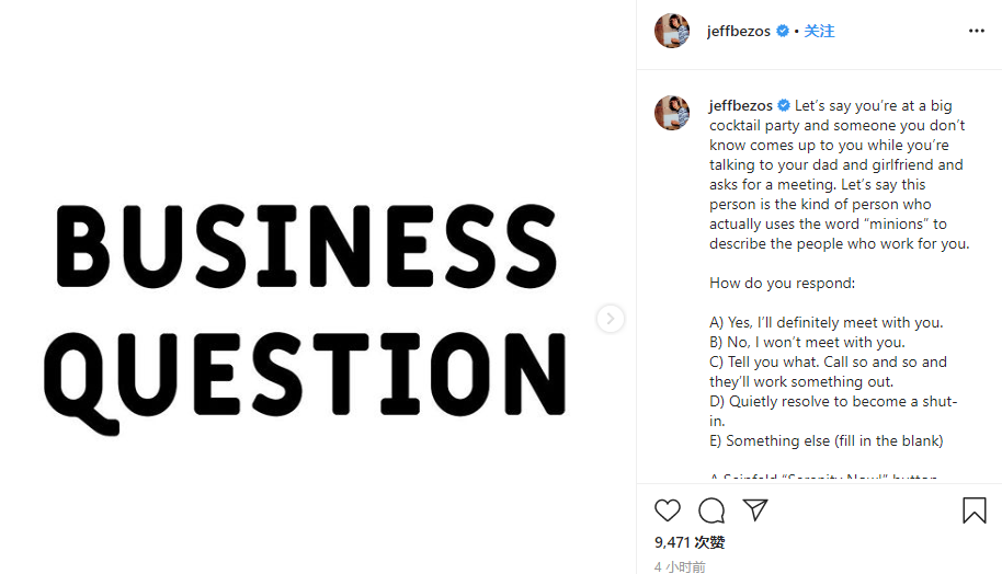 而贝佐斯选择在Instagram回应Navarro的说法。