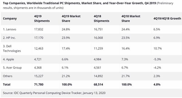 IDC关于2019Q4全球PC市场的报告