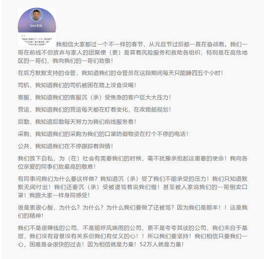 对此前遭恶意P图污蔑倒卖口罩的顺丰小哥,他表示感同身受。“我们不是很赚钱的公司,不是能呼风唤雨的公司,更不是夸夸其谈的公司,我们来自于基层,没有背景没有关系,但我们有仗义的心,所以要坚持最后!”