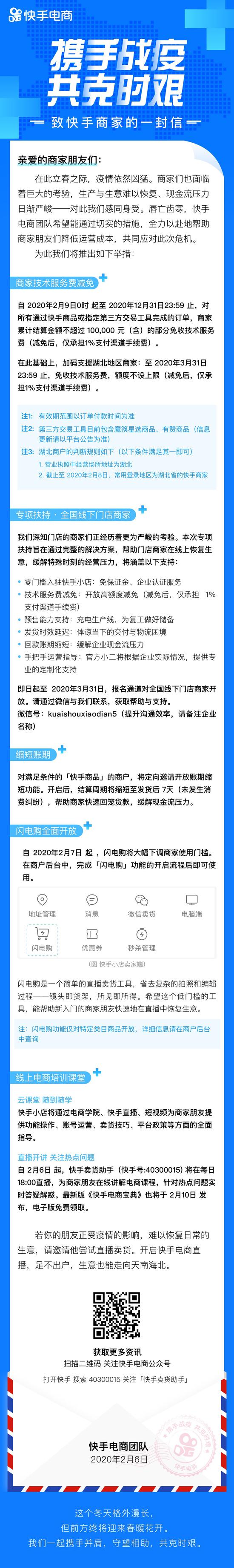 2月7日上午消息,为帮助商家降低运营成本,共同应对疫情带来的负面影响,快手电商对所有商家进行“技术服务费”减免:从2020年2月9日至 2020年12月31日,所有通过快手商品或指定第三方交易工具完成的订单,商家累计结算金额不超过10万元(含)的部分免收技术服务费(减免后,仅承担 1% 支付渠道手续费)。在此基础上,加码支援湖北地区商家:至 2020年3月31日,免收技术服务费,额度不设上限(减免后,仅承担 1% 支付渠道手续费)。