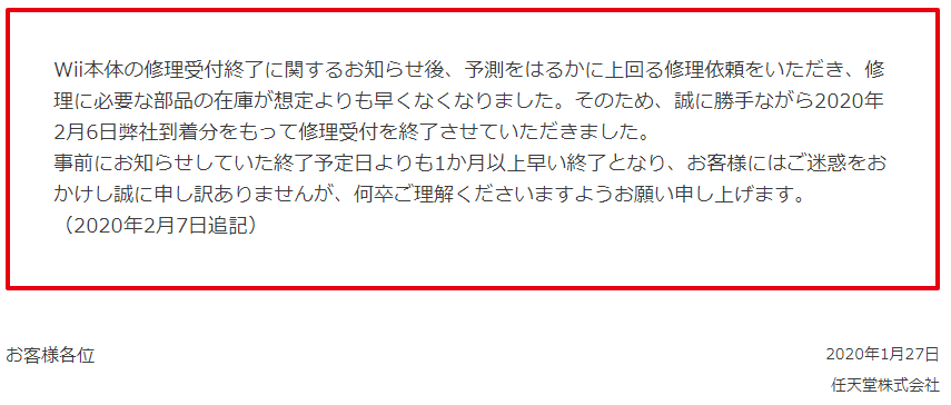 上个月底任天堂发布声明从3月31日开始将不再接受任何Wii主机本体的修理请求(型号RVL-001),2月7日今天再次宣布于2月6日起终止Wii主机维修,今天起不会接受任何报修申请。