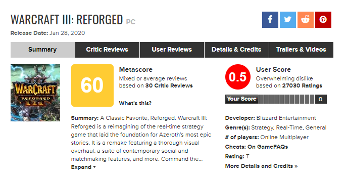 《魔兽3重制版》在Metacritic上的用户评分已经成为了其收录的所有游戏最低,虽然其中包含了不少被放大的玩家怒火,但是对一款背刺游戏原始玩家群体的重制版来说,很难令人感到同情。