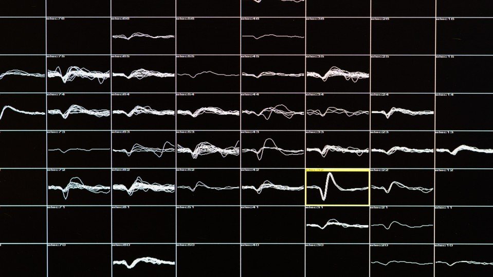 戈麦斯大脑的电信号,每个格子代表一个电极,格子中弯弯曲曲的线条,显示的是来自神经元的信号