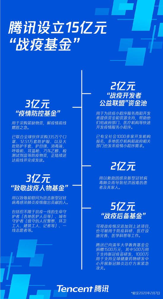腾讯宣布设立15亿元“抗击新型冠状病毒感染肺炎疫情综合保障基金”(以下简称战疫基金)。这是腾讯在设立首期3亿元疫情防控基金、2亿元战疫开发者公益联盟资金池后,再次升级追加10亿元基金,为抗击疫情进行助力。