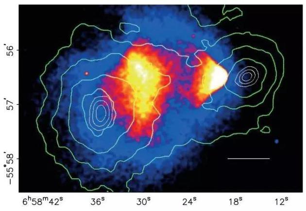 图3:合并星系团中的热气体分布和总质量分布对比图。中间的红蓝色代表着热气体的分布,高亮度表征高密度区域;绿色等高线描述合并星系团的总质量分布。合并星系团中热气体中心和引力中心不重合是暗物质存在的另一个关键证据。 图片来源:https://astrobites.org/2016/11/04/the-bullet-cluster-a-smoking-gun-for-dark-matter/