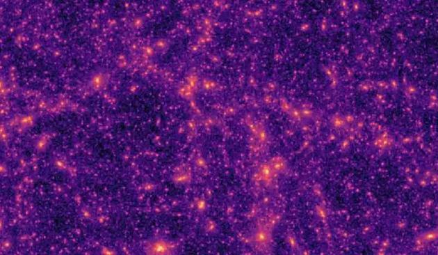 图1: 宇宙学家们用超级计算机模拟的宇宙中暗物质分布图景,其中亮度表征着当地的暗物质密度,亮点为高密度区,星系和星系团将在这些高密度区中形成。 图片来源:https://phys.org/news/2019-09-artificial-Intelligence-probes-dark-universe.html