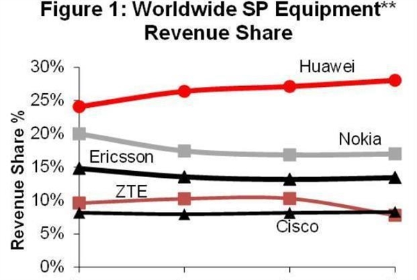在全球电信设备市场,华为已经远远领先于其他厂商。而诺基亚在2018年超越爱立信之后一直稳坐第二宝座;中兴科技在爱立信之后排在第四位,第五名则是思科。