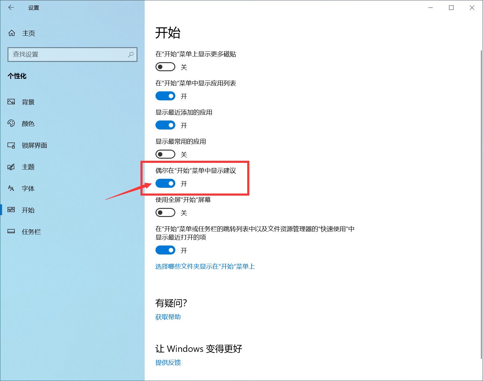 设置方法是打开设置,然后导航到个性化>开始,然后禁用以下选项:偶尔在“开始”菜单中显示建议