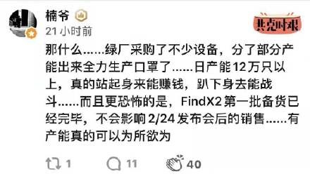 针对生产口罩的传闻,OPPO方面回应称,确实调派了一批技术人员与工人,支援相关企业进行口罩生产。近日网络上流传称,由于口罩产能不足,OPPO和vivo组织员工和产能进行口罩生产。